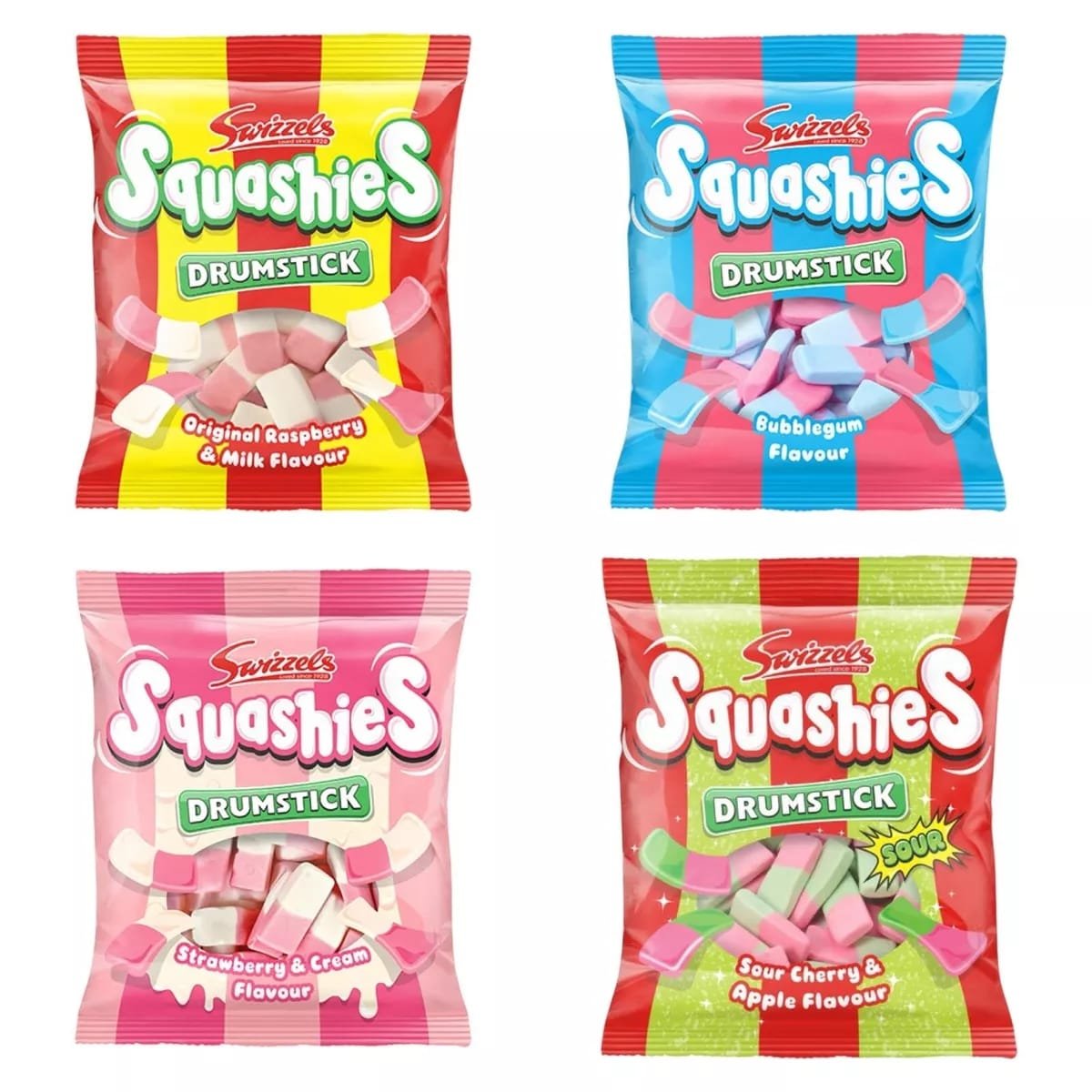 The soft, chewy sensation of your favorite lolly, now in a squishy sweet! Our Swizzels Drumstick Squashies offer a delightful burst of flavor. Enjoy the classic Original Raspberry & Milk, the sweet nostalgia of Bubblegum, the creamy delight of Strawberry & Cream, or the exciting tang of Sour Cherry & Apple. A perfect treat for any moment.