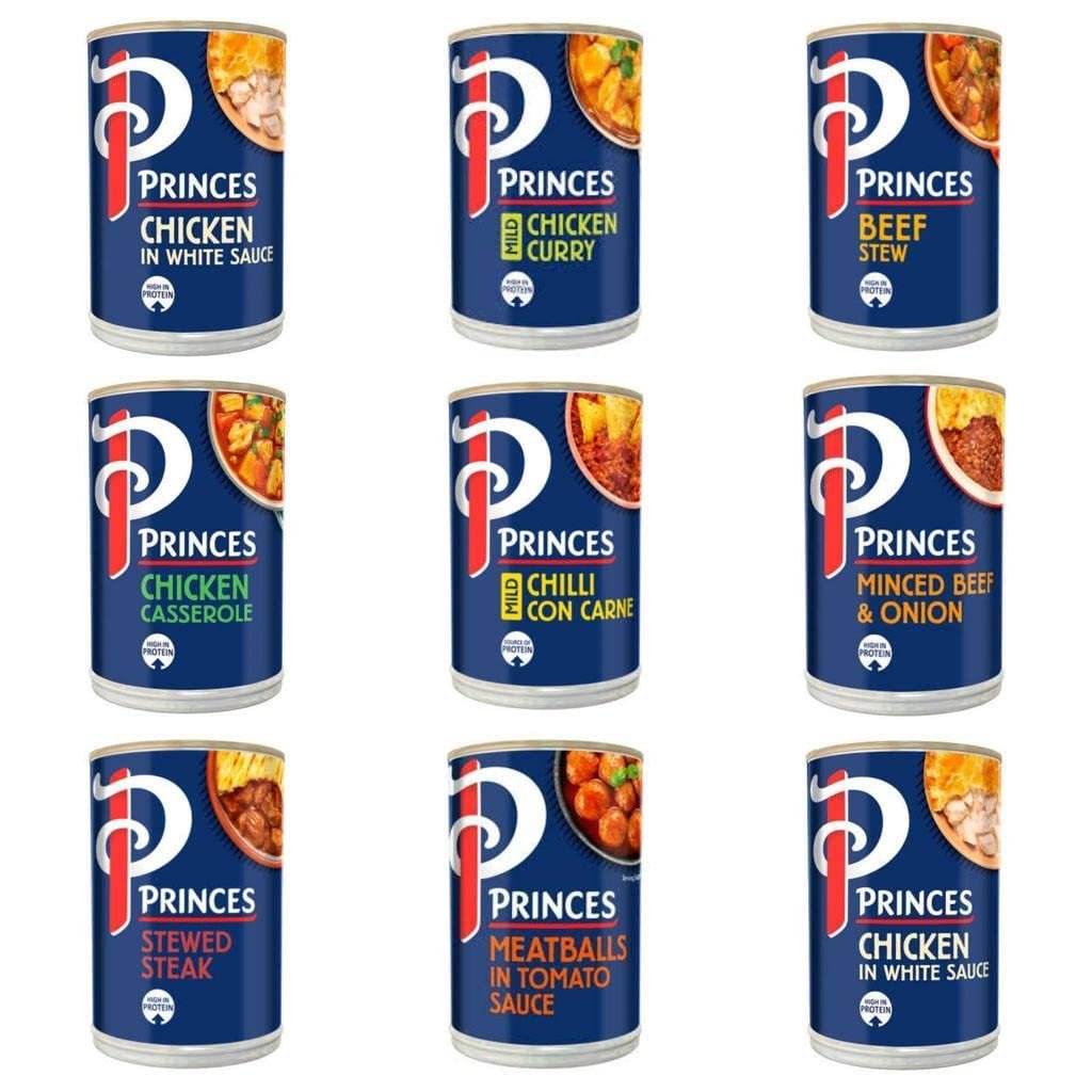 Nine cans of Princes ready meals, including Chicken in White Sauce, Chicken Curry, Beef Stew, Chicken Casserole, Mild Chilli Con Carne, Minced Beef & Onion, Stewed Steak, and Meatballs in Tomato Sauce.